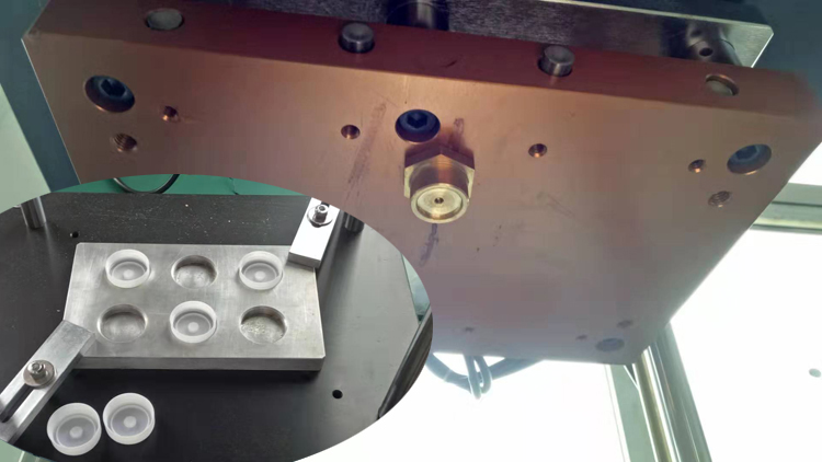 PTFE防水透气膜与塑料连接热熔焊接机操作流程:装配好产品—>置入底工装—>按下启动按钮—>设备自动完成压接—>循环下一个工件。