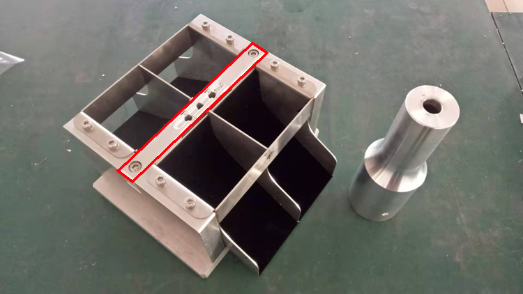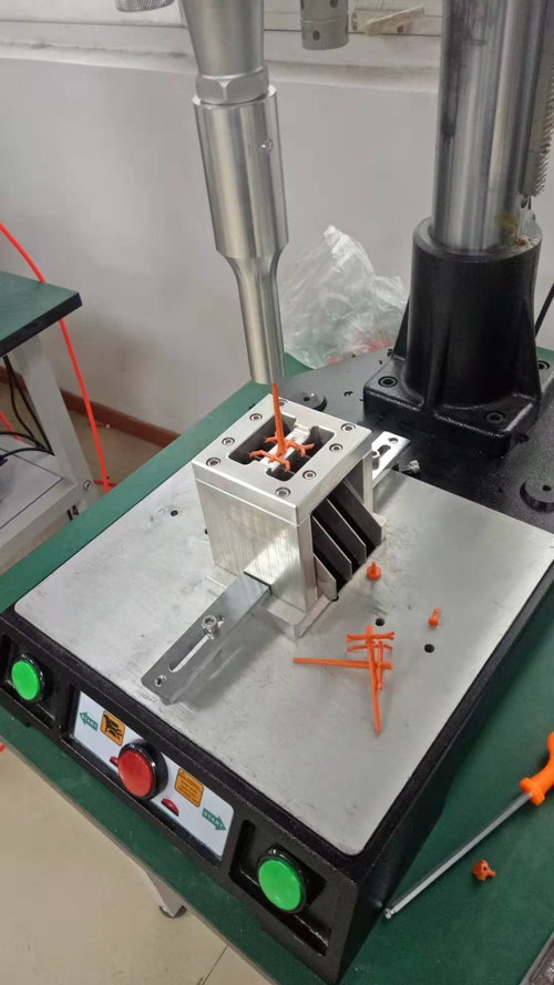 超声波模具头频率为15khz,单件震落时间为0.2s,下工装有专用滑槽,震落下的产品分类,不同产品只需要更换产品定位槽(上图红线标注)。