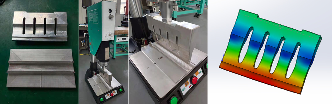 30cm尼龙魔术贴搭接固定超声波接长模具频率15khz,焊接尺寸:300*10mm,配套3200w超声波塑料焊接机,端面出齿,焊接后产品牢固长时间使用不脱落,我司专业生产销售多功率超声波焊接机,同时定制超声波模具可以配套国内外各品牌超声波焊接机,设备有大量现货供应,超声波模具工装交货周期为3天。